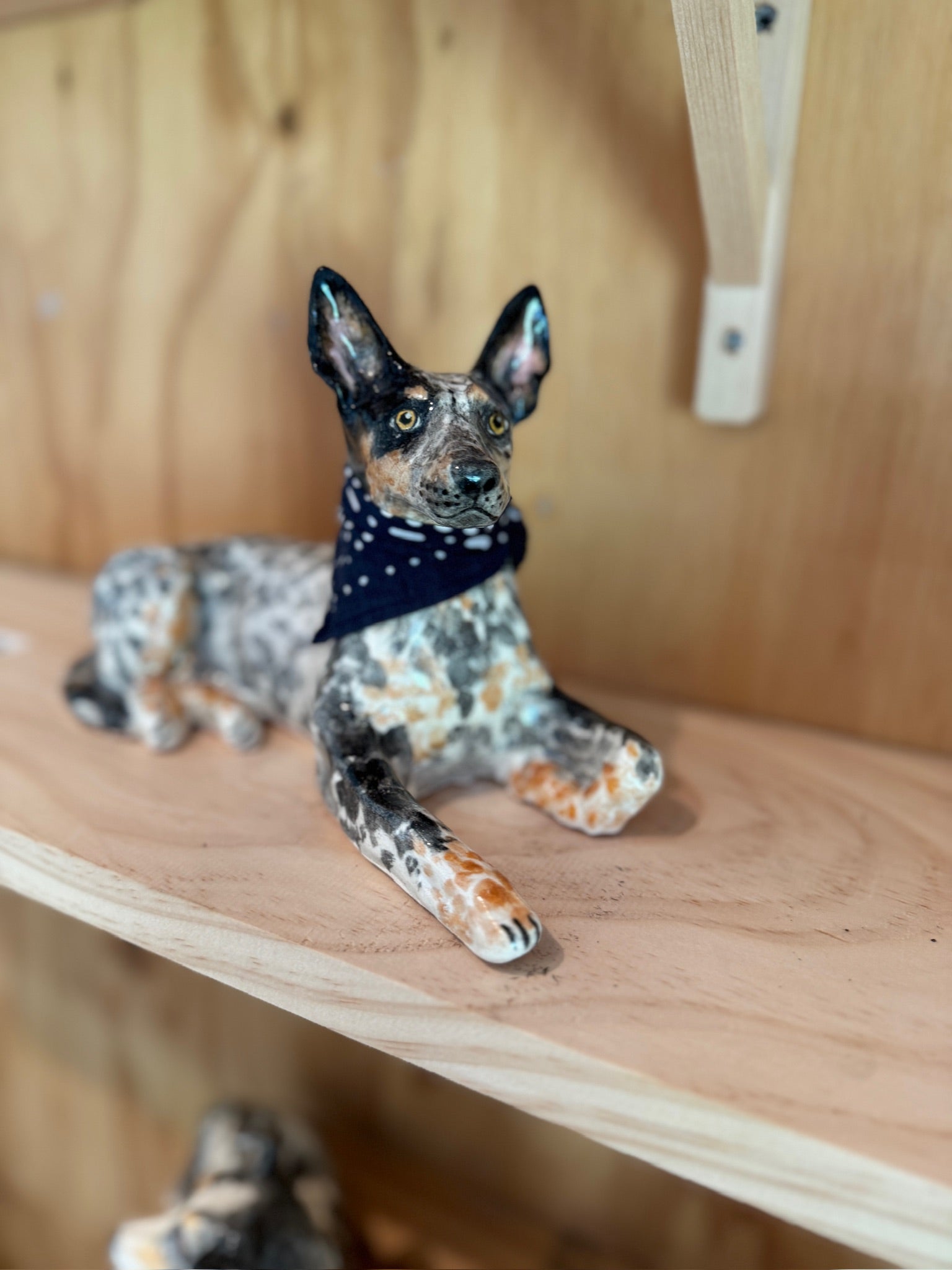 Each dog is created using photos and notes that you provide. It starts as a lump of earthenware clay & is sculpted into your dogs form. It is then 'bisqued' in the kiln at 1000° / 2000 F to harden the clay into ceramic. Once porous it's ready to be painted.