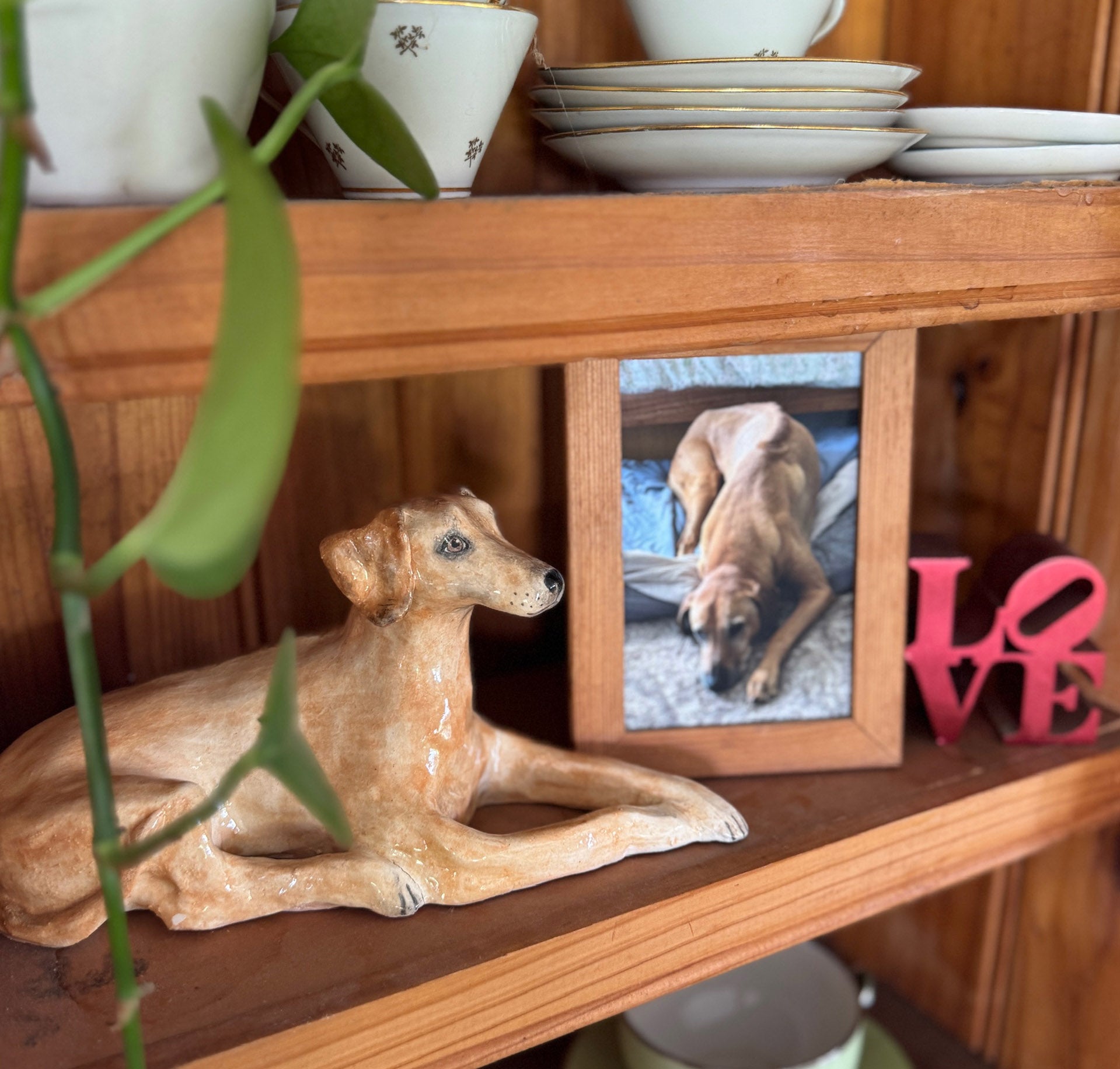 The figure is then painted with your dogs unique markings, dipped in a pink powdery glaze and fired again in the kiln to create the luminous glossy final piece, the magical version of your treasured friend. The time from placing your order to receiving your dog is roughly 4-6 weeks.